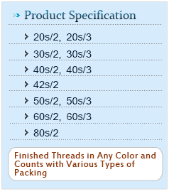 The raw material is “POLYESTER STAPLE FIBER FOR SEWING THREAD, 1.2Dx38mm, BRIGHT.” We can make various types of packing with any counts and color to customers’ needs, ex: 5000y/cone,king spool; 10000m/cone,king spool... etc.